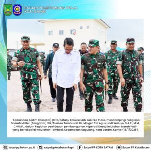 Komandan Kodim (Dandim) 0316/Batam, Kolonel Arh Yan Eka Putra, mendampingi Panglima Daerah Militer (Pangdam) XIX/Tuanku Tambusai, Dr. Mayjen TNI Agus Hadi Waluyo, S.A.P., M.M., CHRMP., dalam kegiatan peninjauan pembangunan Koperasi Desa/Kelurahan Merah Putih yang berlokasi di Kelurahan Tembesi, Kecamatan Sagulung, Kota Batam, Kamis (15/1/2026).