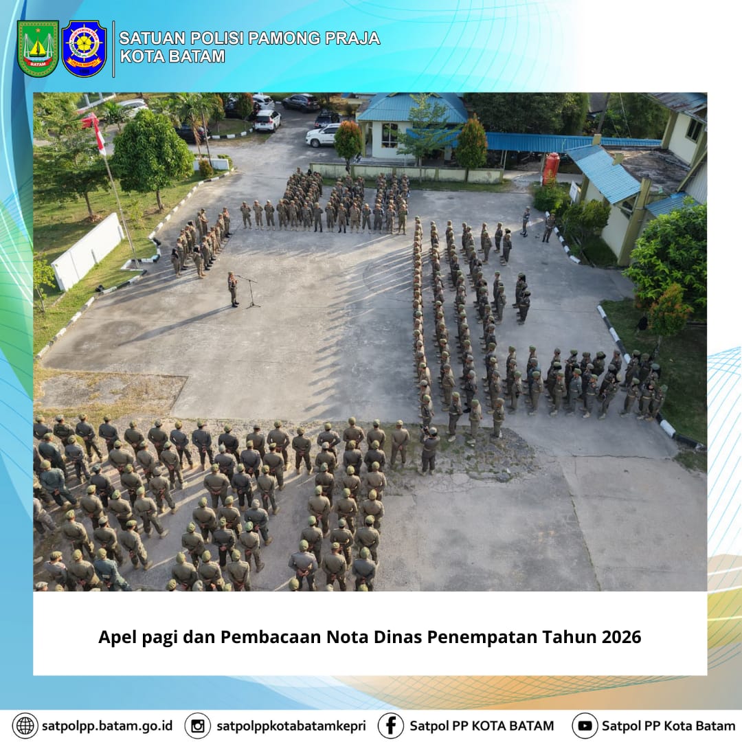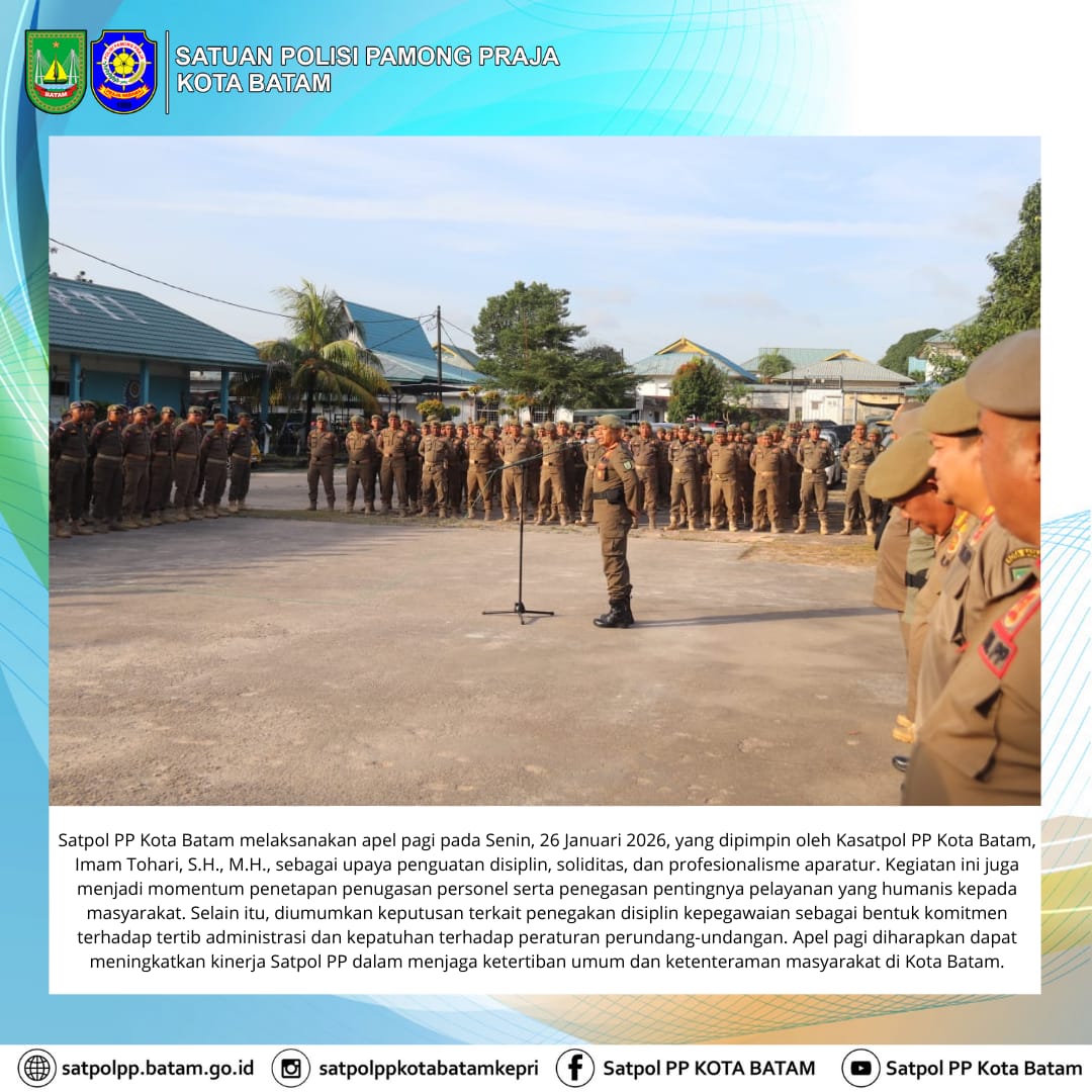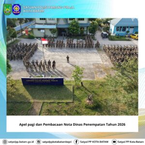 Batam — Senin, 26 Januari 2026, Satuan Polisi Pamong Praja (Satpol PP) Kota Batam melaksanakan apel pagi seluruh personel di Lapangan Apel Markas Komando Satpol PP Kota Batam. Kegiatan ini dipimpin langsung oleh Kepala Satpol PP Kota Batam, Imam Tohari, S.H., M.H., sebagai upaya penguatan disiplin, soliditas, serta kesiapan personel dalam menjalankan tugas pelayanan dan penegakan Peraturan Daerah.