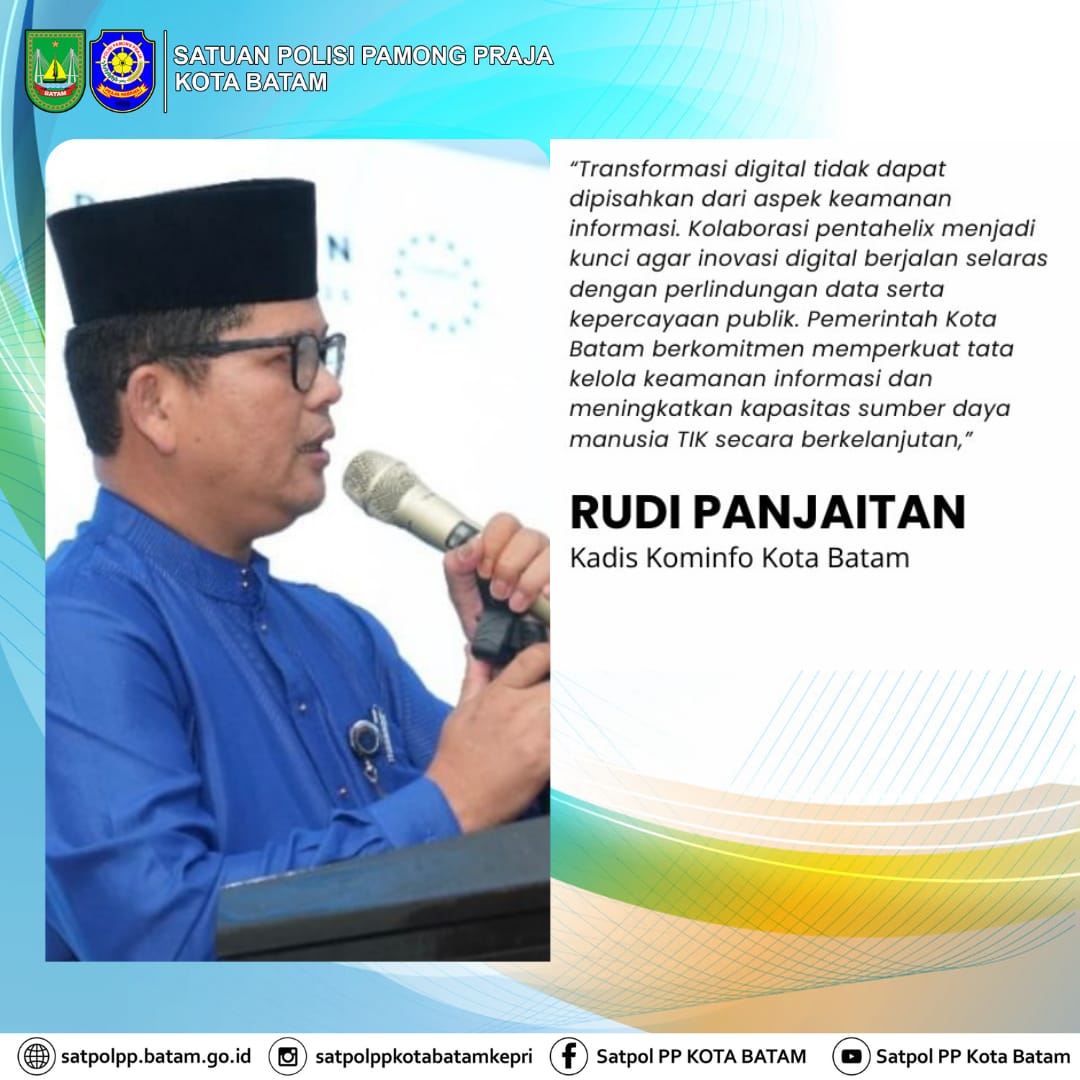 “Transformasi digital tidak dapat dipisahkan dari aspek keamanan informasi. Kolaborasi pentahelix menjadi kunci agar inovasi digital berjalan selaras dengan perlindungan data serta kepercayaan publik. Pemerintah Kota Batam berkomitmen memperkuat tata kelola keamanan informasi dan meningkatkan kapasitas sumber daya manusia TIK secara berkelanjutan,” ujar Rudi.