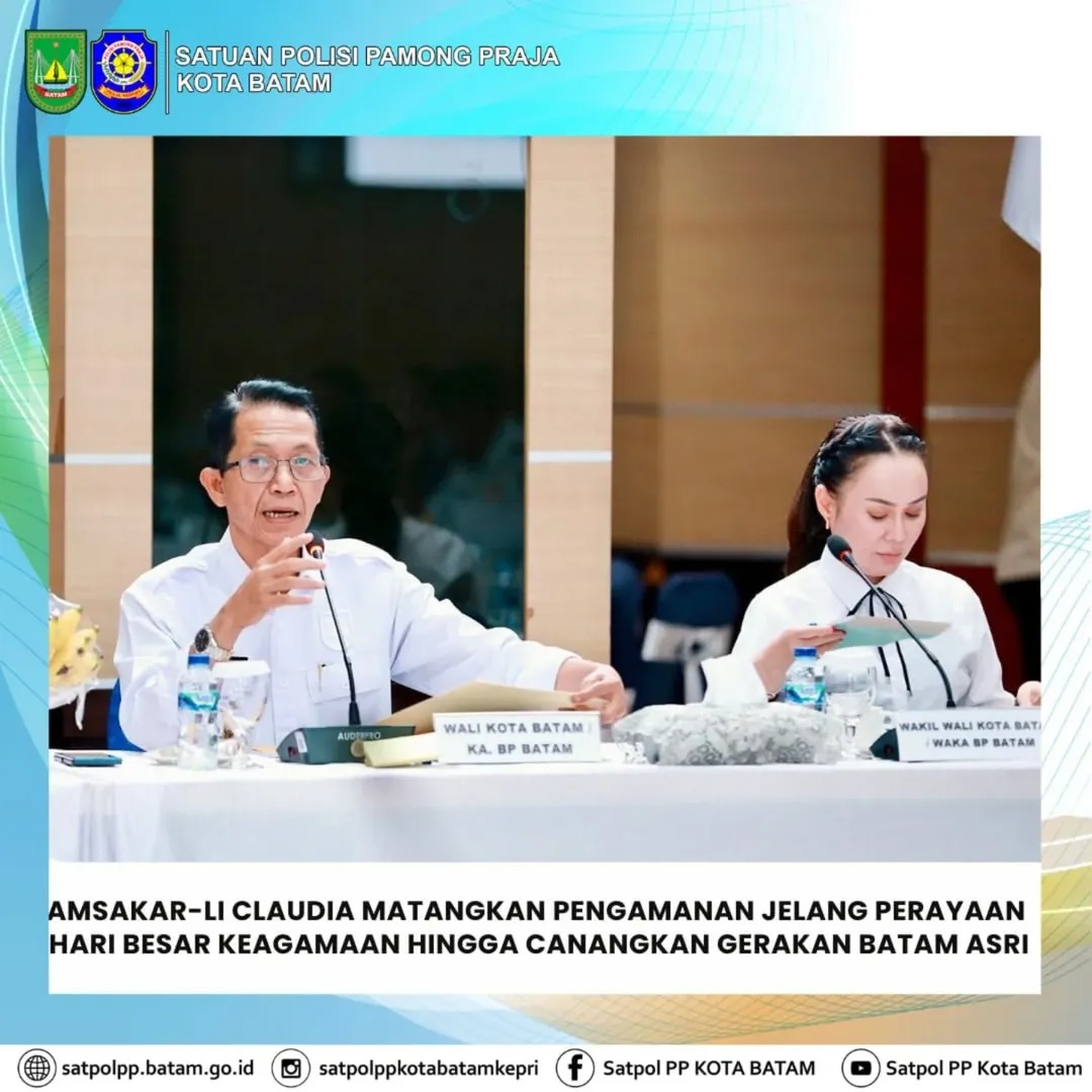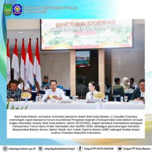 Wali Kota Batam, Amsakar Achmad, bersama Wakil Wali Kota Batam, Li Claudia Chandra, memimpin rapat bersama Forum Koordinasi Pimpinan Daerah (Forkopimda) Kota Batam di Aula Engku Hamidah, Kantor Wali Kota Batam, Senin (9/2/2026). Rapat tersebut membahas kesiapan menyambut Tahun Baru Imlek, Ramadan dan Idulfitri 2026, sekaligus pencanangan Gerakan Masyarakat Batam Aman, Sehat, Resik, dan Indah (Gema Batam ASRI) sebagai tindak lanjut arahan Presiden Republik Indonesia.