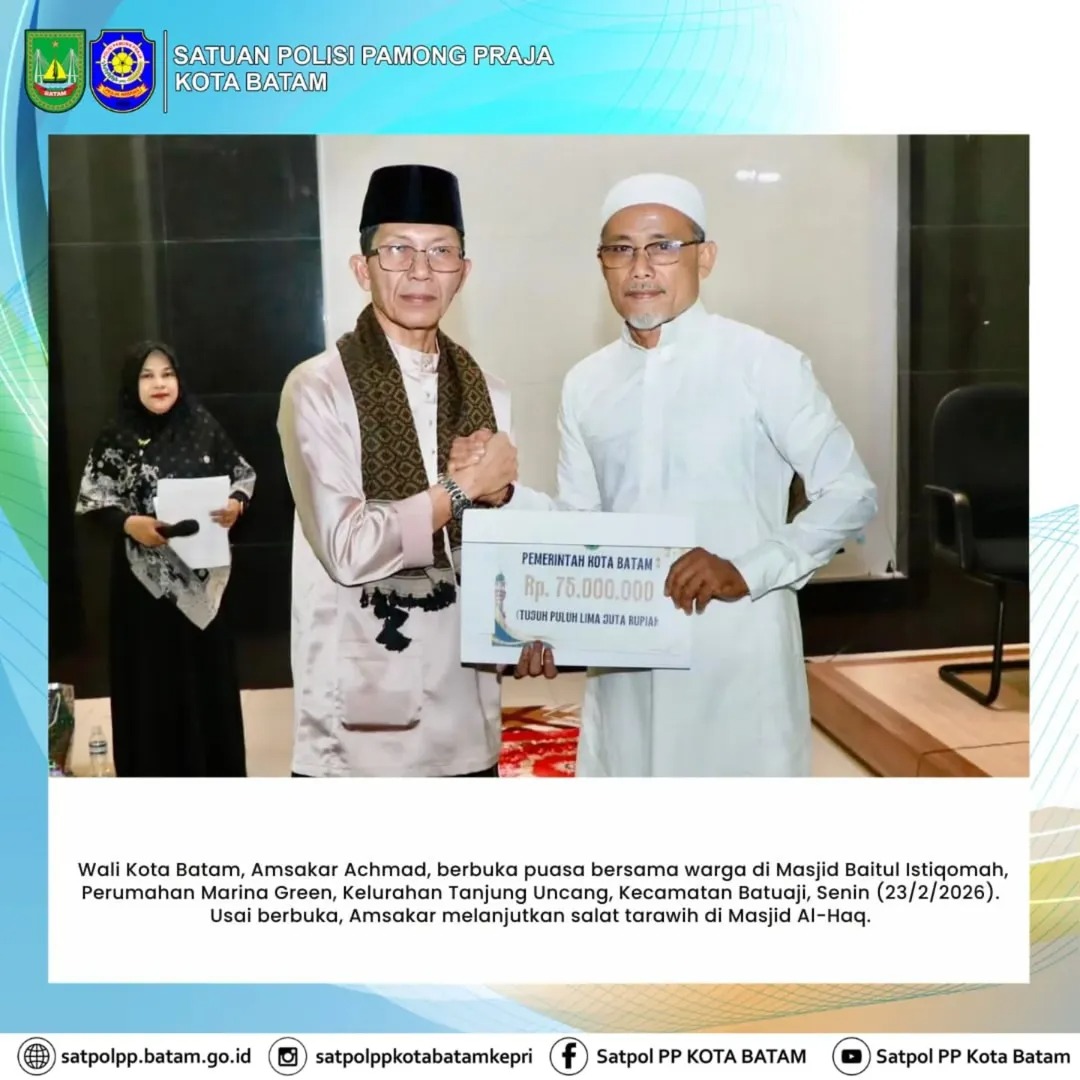 Wali Kota Batam, Amsakar Achmad, berbuka puasa bersama warga di Masjid Baitul Istiqomah, Perumahan Marina Green, Kelurahan Tanjung Uncang, Kecamatan Batuaji, Senin (23/2/2026). Usai berbuka, Amsakar melanjutkan salat tarawih di Masjid Al-Haq.