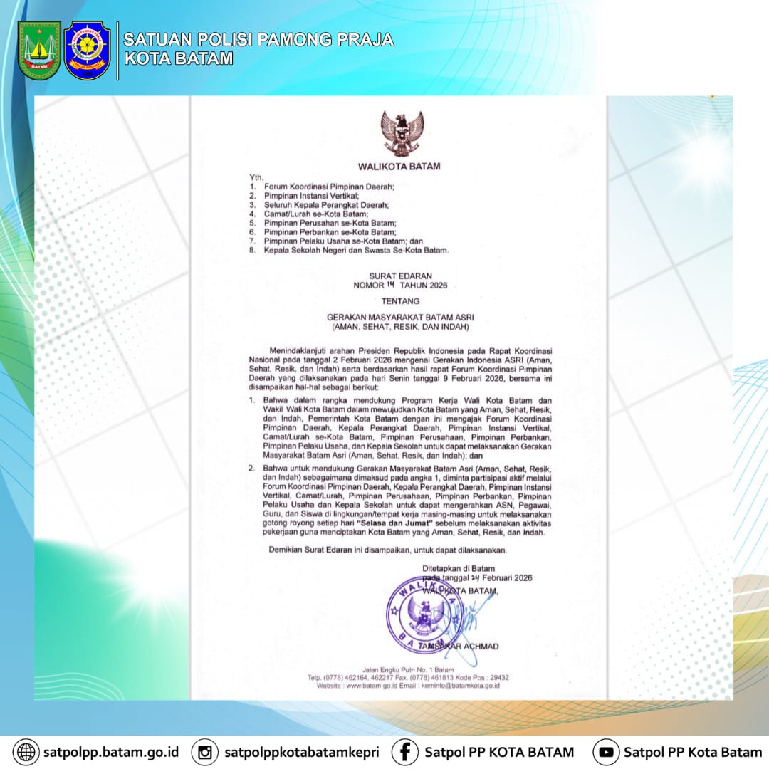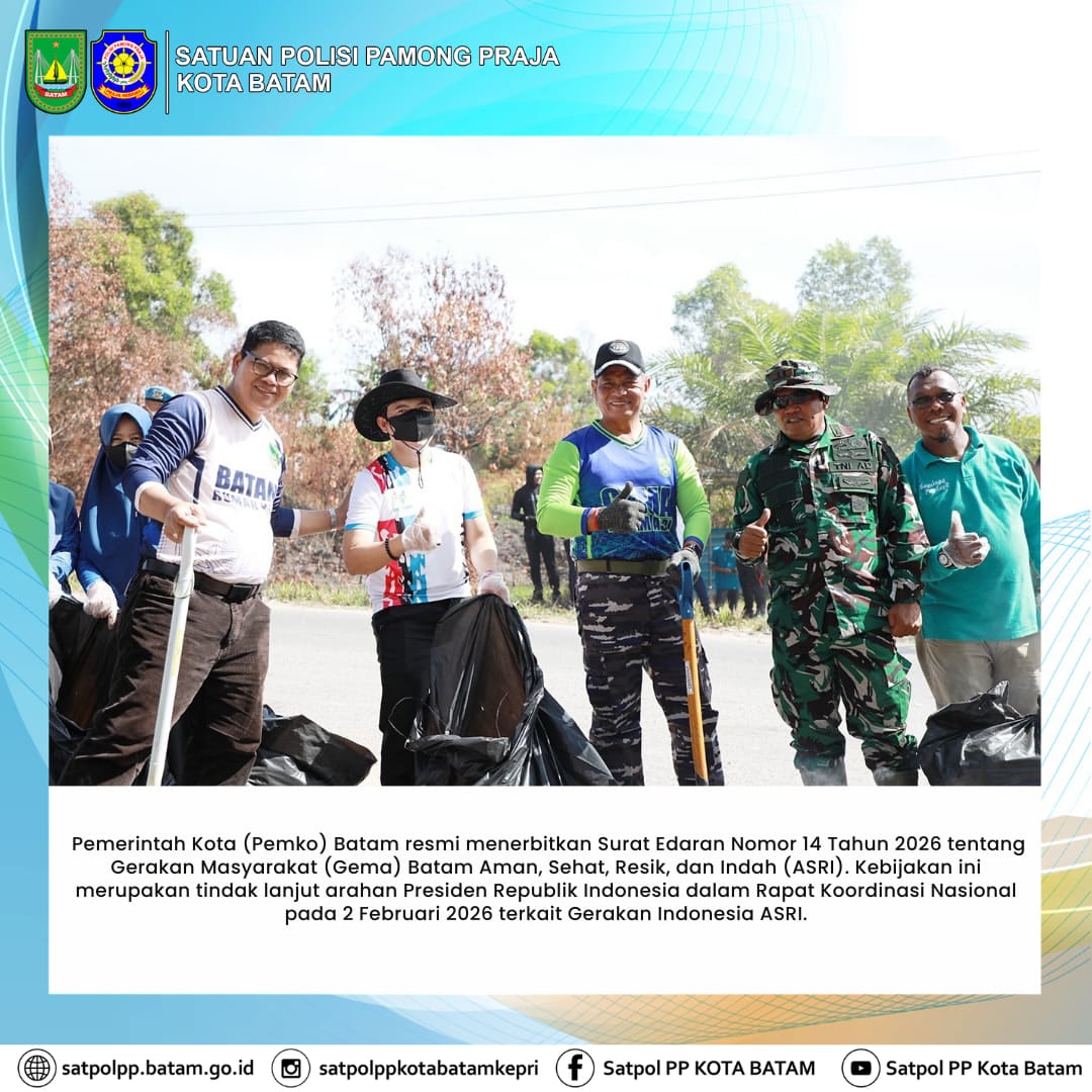 Pemerintah Kota (Pemko) Batam resmi menerbitkan Surat Edaran Nomor 14 Tahun 2026 tentang Gerakan Masyarakat (Gema) Batam Aman, Sehat, Resik, dan Indah (ASRI). Kebijakan ini merupakan tindak lanjut arahan Presiden Republik Indonesia dalam Rapat Koordinasi Nasional pada 2 Februari 2026 terkait Gerakan Indonesia ASRI.