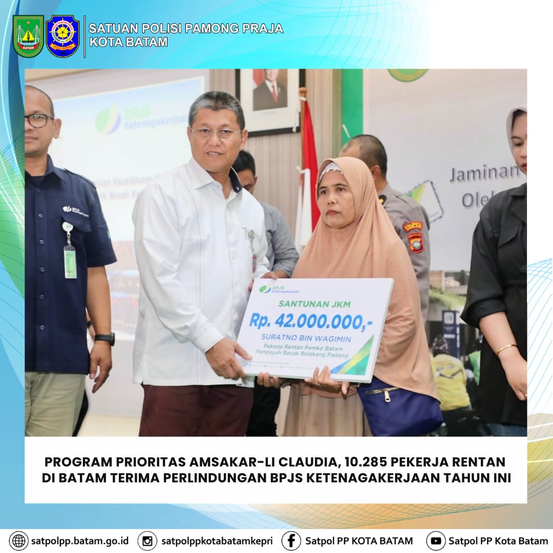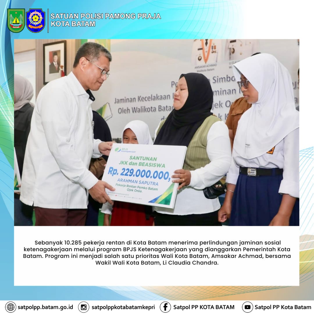 Sebanyak 10.285 pekerja rentan di Kota Batam menerima perlindungan jaminan sosial ketenagakerjaan melalui program BPJS Ketenagakerjaan yang dianggarkan Pemerintah Kota Batam. Program ini menjadi salah satu prioritas Wali Kota Batam, Amsakar Achmad, bersama Wakil Wali Kota Batam, Li Claudia Chandra.